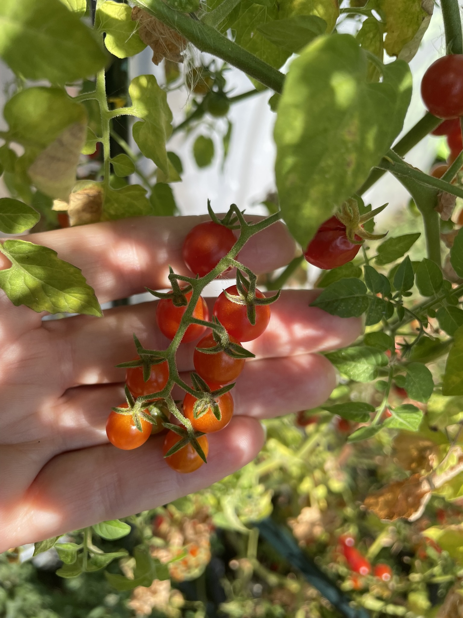 A very special thank you goes to my friend’s dad – Geoff from Weymouth, who generously sent us his carefully saved tomato seeds. Thanks to him, we’ve been able to grow some incredible varieties that you don’t see in the shops. Among them are the delightful ‘Spoon’, a miniature tomato that is as sweet as it is charming, a peach-like tomato with a soft fuzzy skin, a mystery yellow variety that has surprised us with its sunny colour and juicy bite, and even a green tomato that is perfectly ripe when it looks unripe!